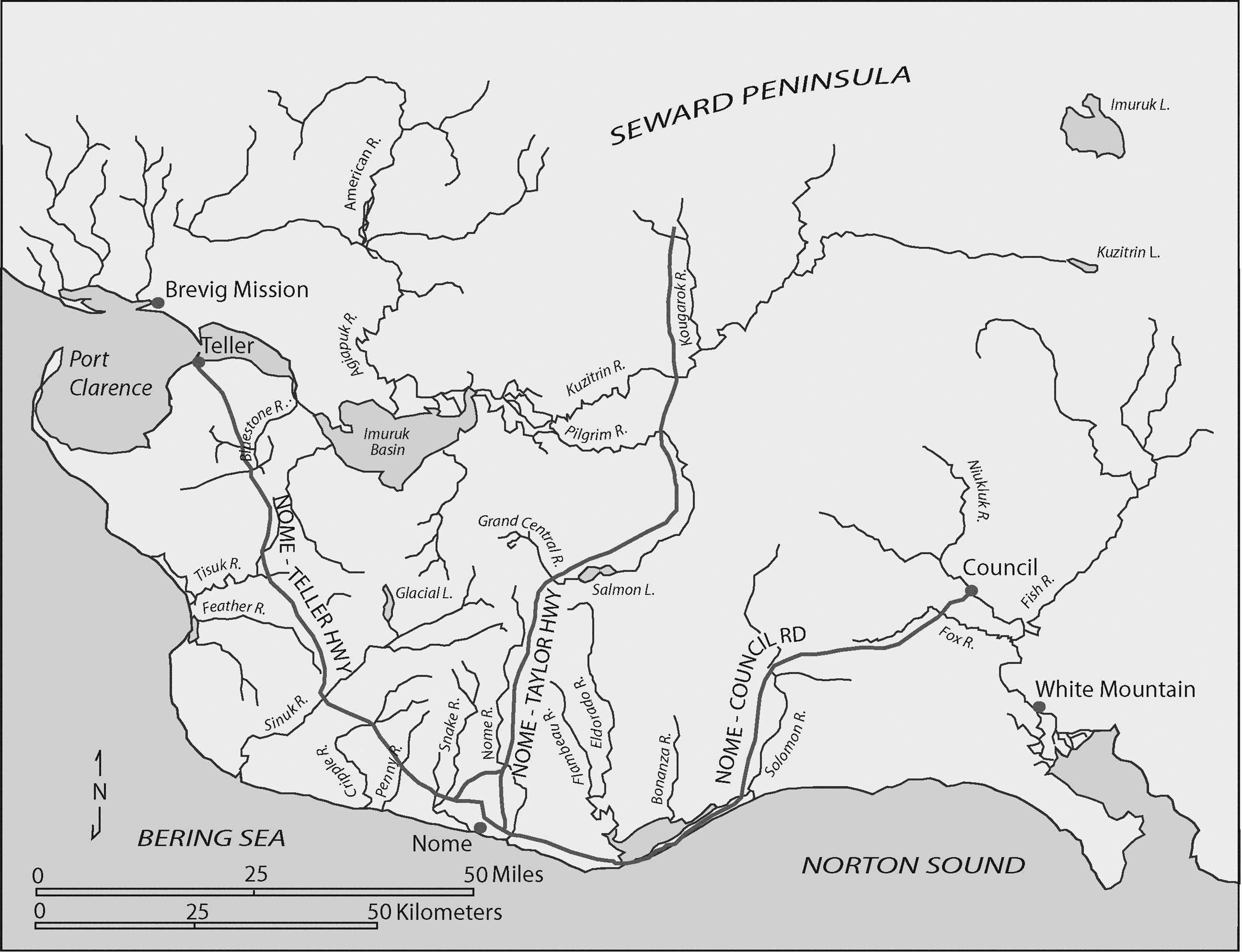 The Nome-Council Road, also known as the Council Road, begins at Nome and stretches for about 73 miles to the old mining town of Council located on the north bank of the Niukluk River. The road parallels about 35 miles of Norton Sound coastline along the beach berm separating Safety Sound from the sea. This road crosses the Nome, Fox, Bear, and Niukluk rivers, as well as the Safety Sound channel. The Niukluk River has some of the highest densities of large Arctic grayling on the Seward Peninsula, with recent research results estimating that there were over 750 fish larger than 15 inches per mile of river in the 14-mile study area.