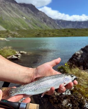 Recently, ADF&G began stocking Symphony Lake with 500 rainbow trout fingerling every other year (even years; 2020, 2022, and 2024). With rainbow trout introduced, it is expected that the rainbows will eat on juvenile grayling and reduce the grayling density, allowing the grayling to grow to larger size. With a diet of grayling, the rainbow trout should see some pretty good growth rates! Unlike the Arctic grayling that were diploids (can reproduce), the rainbow trout are triploid (sterile) and so if it is found that the rainbow trout are detrimental to the grayling population, stocking can be discontinued at any time. The rainbow trout stocking provides for a multi-species experience at Symphony Lake with an anticipated win-win scenario of big grayling and big rainbows! The photo of the rainbow trout, which was taken by Nicole Greenwell, is an example of the current size of these fish. To add, there are native Dolly Varden in Eagle Lake. I challenge any angler visiting Symphony and Eagle to catch all three species, completing what I personally call the "South Fork Eagle River Trail Grand Slam"!