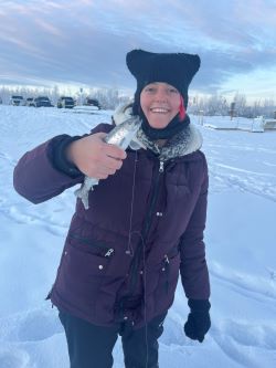 Epstein, 25, of Charlotte, N.C., was one of approximately 200 people who braved the chilly, single-digit temperatures on Saturday for ADF&G's annual Tanana Lakes Ice Fishing Day. She came to Fairbanks to see the northern lights and saw a flyer about the fishing event at the Morris Thompson Cultural & Visitors Center.