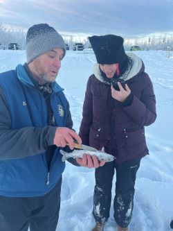Epstein went online to buy a 1-day, nonresident fishing license the morning of the event and showed up eager for another Alaska experience. ADF&G education associate Erik Anderson greeted her, handed her an ice fishing rod, gave her a brief tutorial and directed her to one of approximately 100 holes he and other ADF&G staff had drilled in the ice that morning.