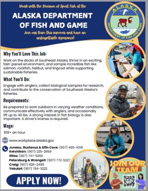Whether you're a local Alaskan or someone looking to spend your summer working in Alaska, this is the perfect opportunity to gain experience and make a difference! You’ll work in scenic locations like Juneau, Yakutat, Sitka, Ketchikan, Petersburg, Wrangell, Gustavus, Elfin Cove, and Craig, all while interacting with the public and helping ensure Alaska’s fisheries remain healthy for generations to come. Whether you're interviewing anglers, sampling catch data, collecting biological samples, or simply providing helpful information, this is a fantastic chance to gain valuable experience in fisheries management while enjoying Alaska’s natural beauty. Don’t miss out on this chance to make a real difference - apply now and help support the future of Southeast Alaska’s fisheries!
