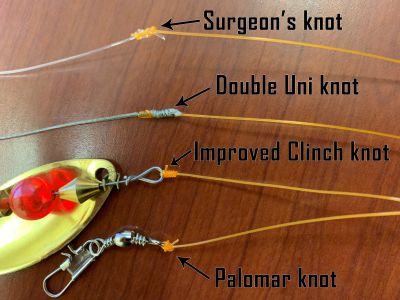 Common fishing knots used by anglers include the Improved Clinch knot, the Palomar knot, the Double-Uni knot and the Surgeon's knot. The Improved Clinch knot and the Palomar knot are used to tie line to a hook, swivel, lure or fly. And the Double-Uni and the Surgeon's knot are used to connect two different types of fishing line.