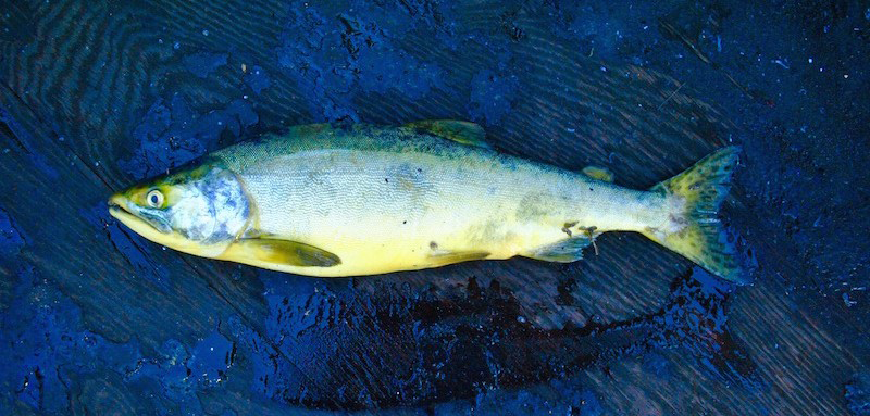 Pink salmon with yellow pigmented skin. Likely due to genetic or congenital defects.