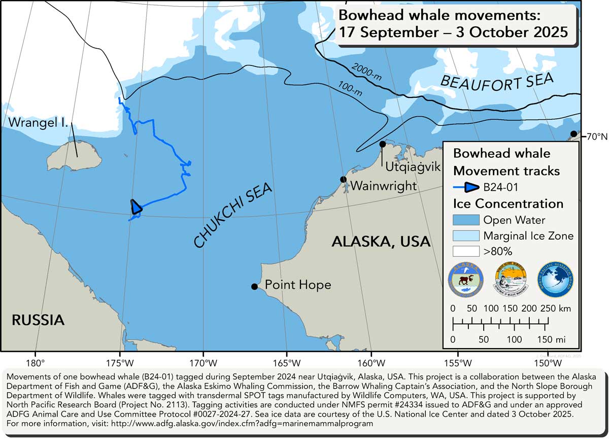 From 17 September – 3 October 2025, we received locations from one tag deployed on a bowhead whale. Bowhead B24-01 moved south, into the central Chukchi Sea, and is currently southeast of Wrangel Island. Sea ice data are courtesy of the U.S. National Ice Center and dated 3 October 2025.