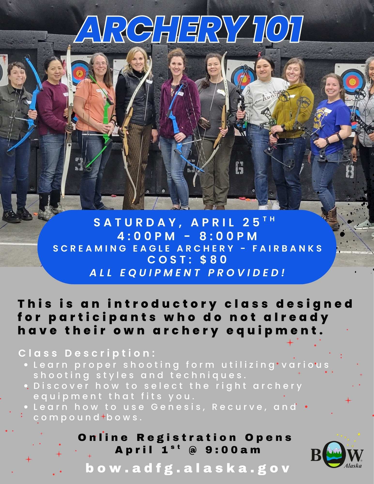 Location and Date: Screaming Eagle Archery Fairbanks, Saturday, April 25th 4:00pm - 8:00pm