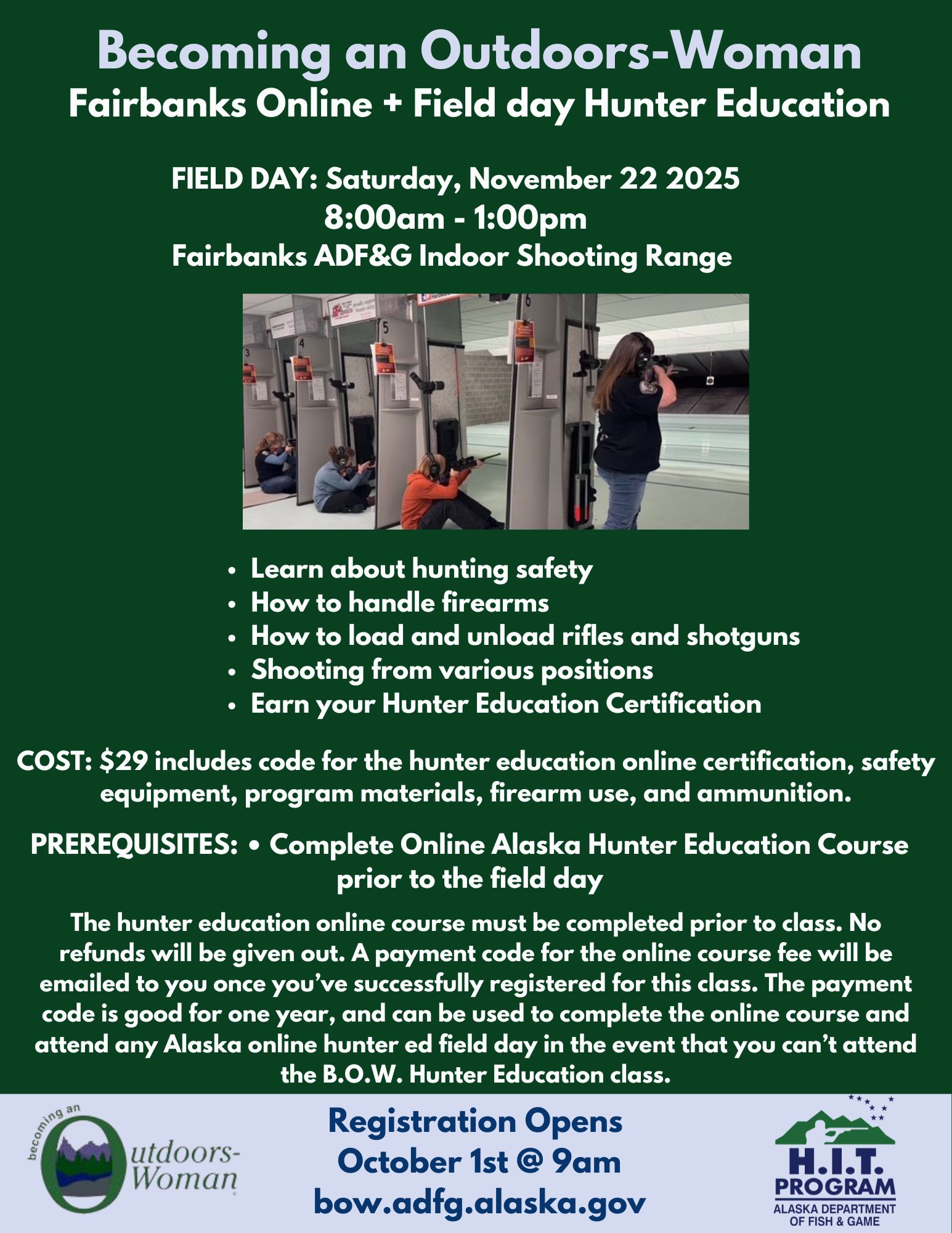 Location and Date: Fairbanks Hunter Education Indoor Shooting Range, Saturday, November 22 2025 8:00am - 1:00pm