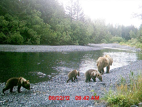 A mom and three cubs. According to Robin, this kind of blonde ruff is common on young bears on Kodiak; it usually fades away as they get older.