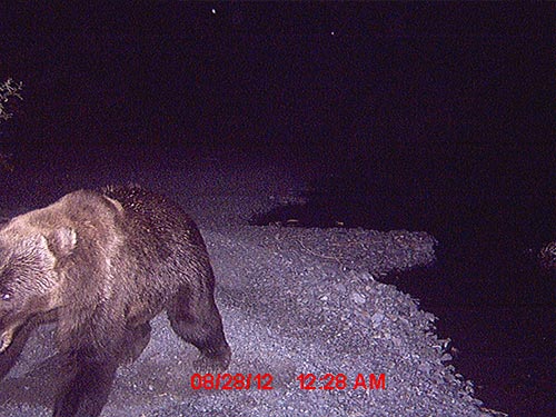 A bear is traveling along a creek at night and encounters another bear. This picture and the next were taken at 12:28 am August 28, 2012.