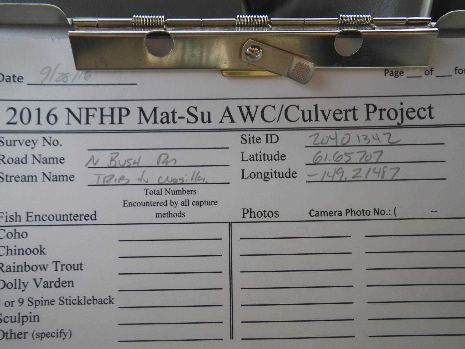 Comments: Updated site photos and fish capture data added from 9/28/16 site visit from Sampling Unmapped Streams in the MSB project. Wetland ponded on upper end. Apparent BLOCKAGE within culvert. Water depth at inlet significantly more than outlet. More than 10 ft inside from inlet. Some woody debris pulled out of inlet. Other sediment certain.
