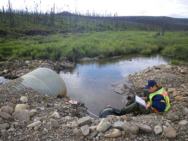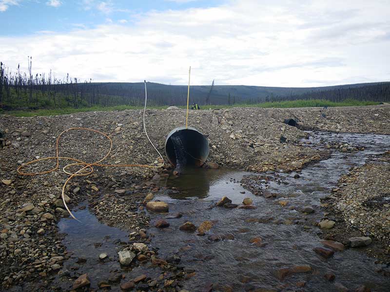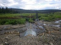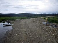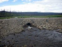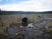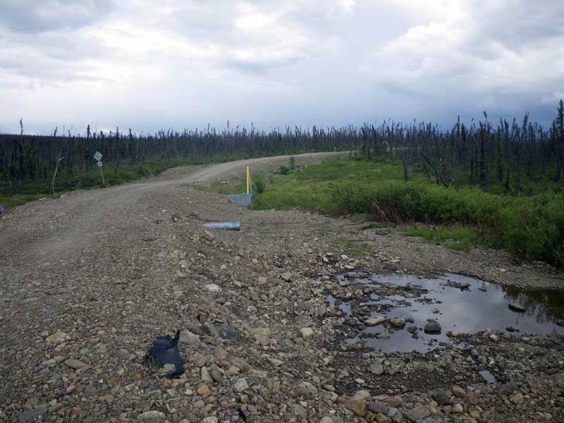 Comments: Road prism and ice damage to pipes have caused a small pond on the u/s side of the road. There is subsurface flow thought the prism. The primary 4 foot pipe has been bent upward and is not allowing much water to flow thought it. Culvert 1 is a small black corrugated plastic pipe with a smooth liner on the inside looks like it was put in when the prism was repaired. There is quite a bit of road fill thoughout the downstream area. U/S is mostly a tundra bog with a deep channel with muddy bottom. Site has been washed out recently and culverts are in pretty bad shape. Multiple overflow pipes through out prism 2 pipes actually passing water. C1 is a black corrugated pipe with a smooth liner inside. C2 is a 4 foot pipe that has been bent up from ice damage and spring flooding with a pipe break about 20 feet from inlet. ***This site has been replaced. This old survey should be used for historical purposes only.***