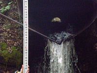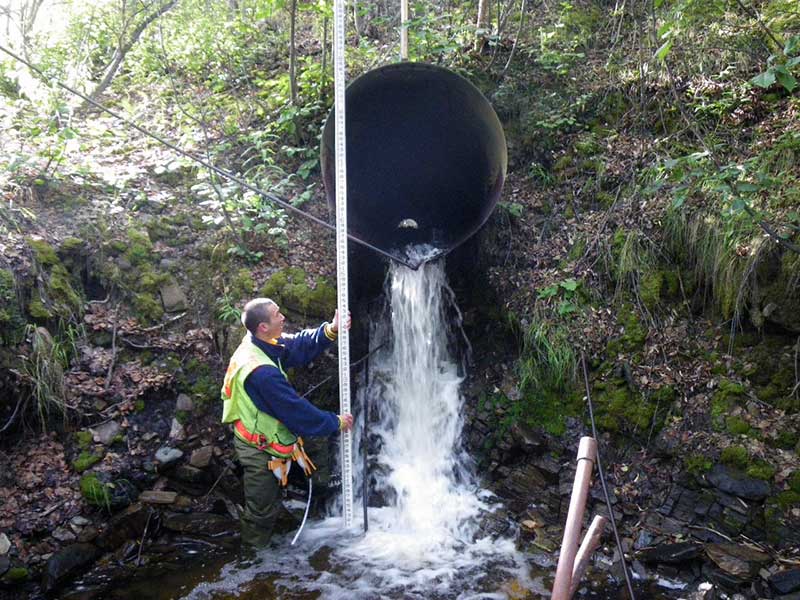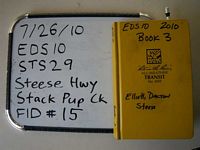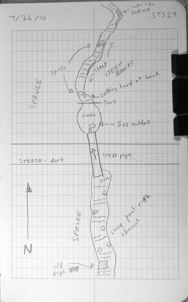 Comments: The outlet of this pipe has a very large outfall height. For this reason, no longitudinal profile was done. The pipe is rusted through and water is pouring through it. The fall from the pipe to the water surface is about 5.20 feet. The max pool depth is about 2.90 feet at 10 feet from the pipe. There are pieces of culvert upstream from this culvert.