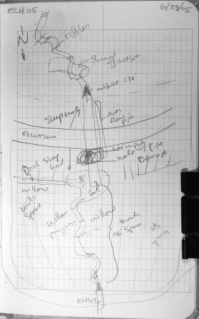 Comments: Pipe is broken and disconnected near inlet. Substrate has fallen into pipe and cannot shoot length with tape or laser. ELH04 is 156' U/S from culvert. Max Pool Depth is .74. About 20 feer of pipe has been sheared off outlet. DOT placard length is 188'. No minnow traps set water too shallow. DOT #1397+00