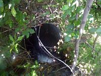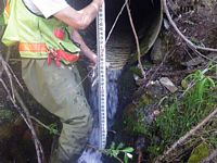 Comments: On 31 mile pullout. This culvert has a big inlet perch approx 1.10ft. The pipe is broken and crushed down towards the inlet and length could not be measured. The pipe is separating into sections. The outlet appears to be a different pipe. It looks as if it could be aluminum.There is also a compound gradient in this pipe. It looks like a small pond has been created by the inlet. Max pool depth is 1.70ft at 4ft from the outlet. No longitudinal profile was taken because of the terrain.