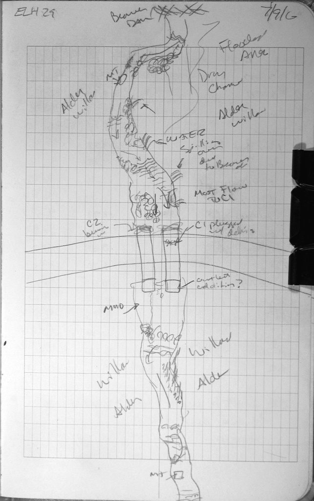 Comments: Two pipes. Outlets appear to have been repaired or this may be an apron. Both pipes are severely clogged with woody debris. Rust lines for both are indiscernable. C2 is almost completely overgrown at the inlet. Measurements may not be accurate for this pipe. For this reason a longitudinal profile for C2 could not be completed. There is also a new beaver dam about 150' upstream from this culvert.