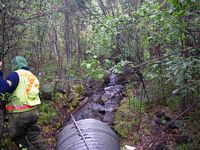 Comments: This culvert appears to have a large amount of animal trapping occuring downstream, lot of old buckets and garbage D/S.This culvert is about 110' downstream from STS09. There is an obvious compound gradient in this pipe, but it was also not possible to get inside the pipe to measure it. No minnow traps were set out because the water was too shallow.