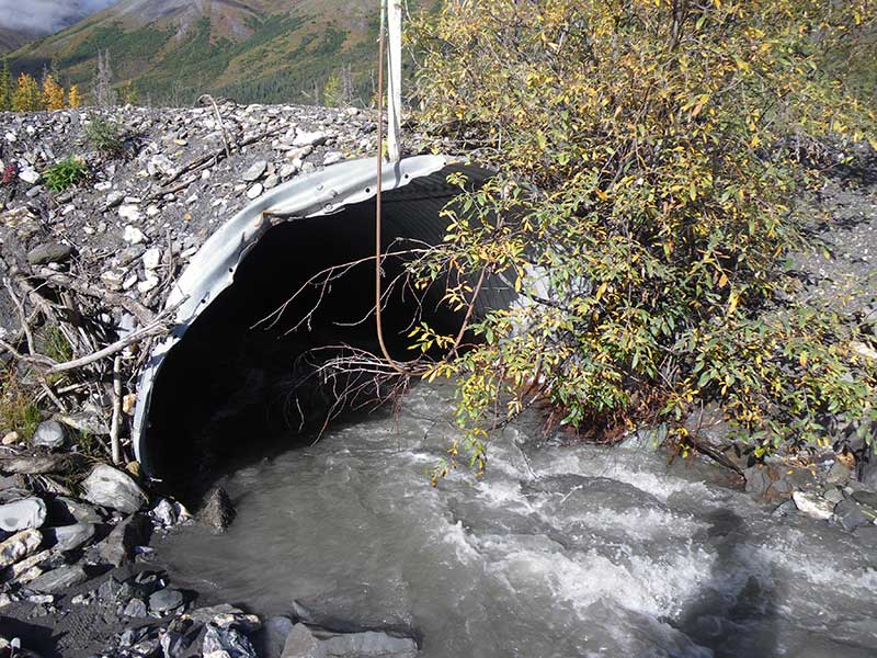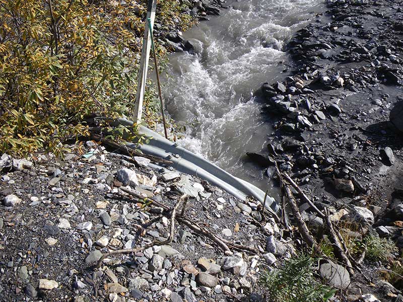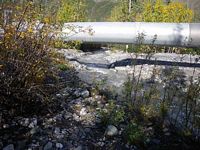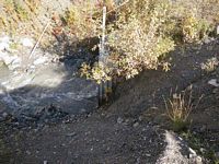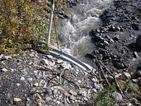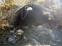Comments: Pipe in outwash stream; stream very steep and vast-flowing; inlet slightly damaged; streambank restoration d/s w/ boulder steps and willow plantings; substrate in lower 1/3 pipe bare metal in upper 2/3, with 1 large boulder