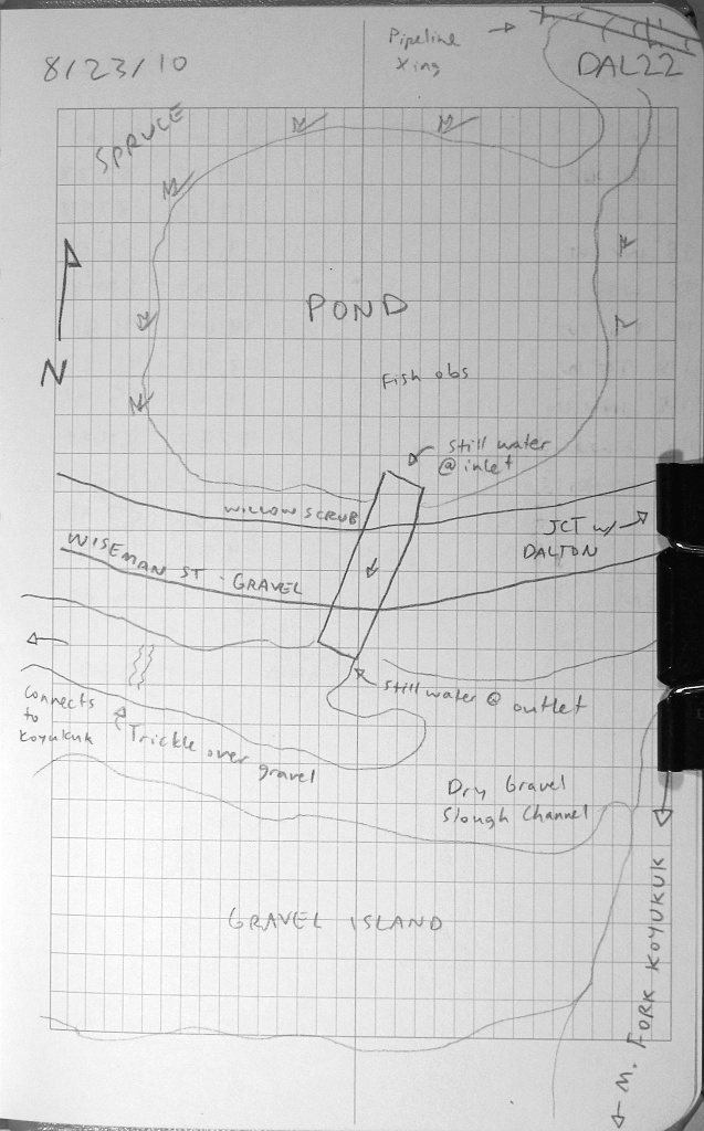Comments: PLMP 224.33 Union Gulch. Fish vis obs u/s in pool, probably grayling and stickleback; confluence koyukuk immed d/s. outlet backwatered by river