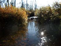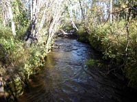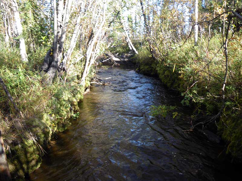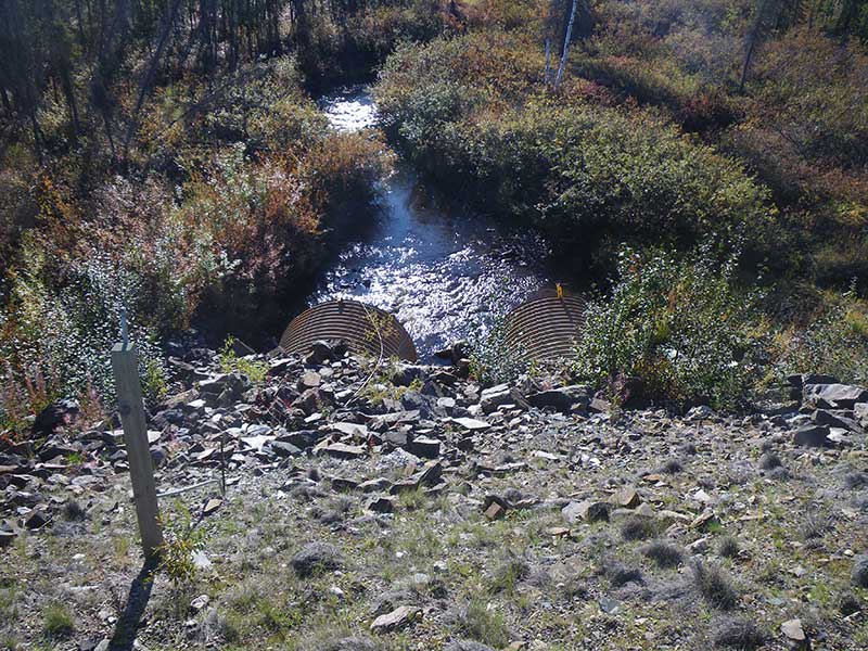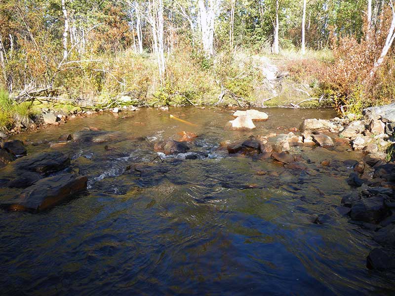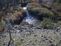 Comments: Bridge u/s at pipeline. Whole inlet is rusty, maybe from stream which is tannic. Stream gradient measured at 0.19% but probably closer to 1% overall. Flat section u/s from culvert. Stream simulation culvert looks nice.