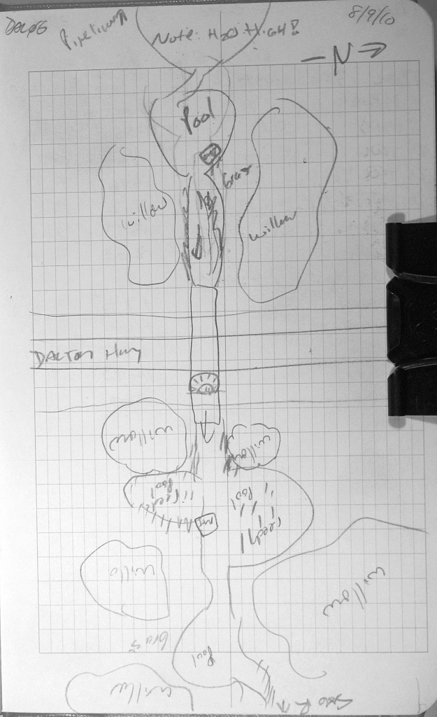 Comments: This pipe appears to have collapsed near the outlet. A medium-sized dark fish was seen near the inlet. No stream widths were taken because this culvert connects two ponds. The DOT placard was used for the length of this culvert.