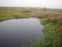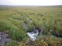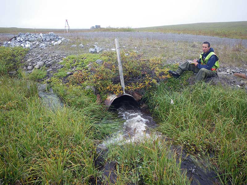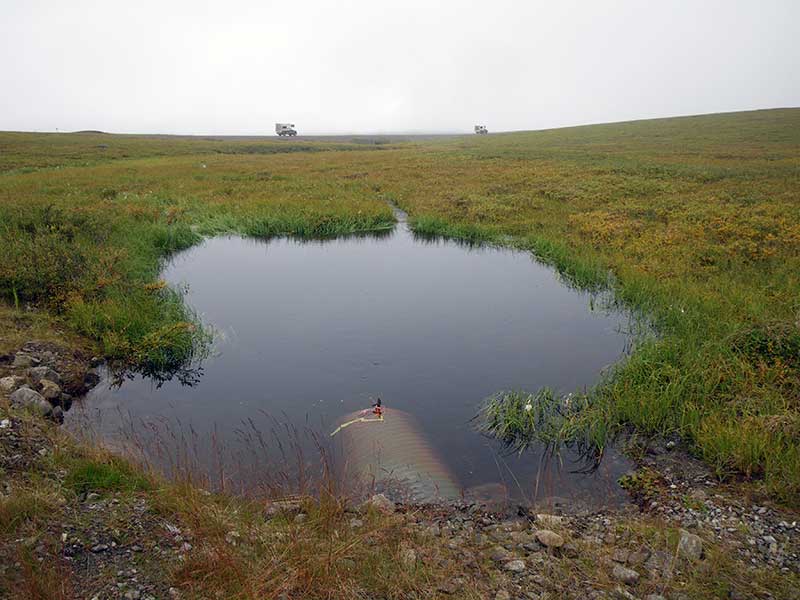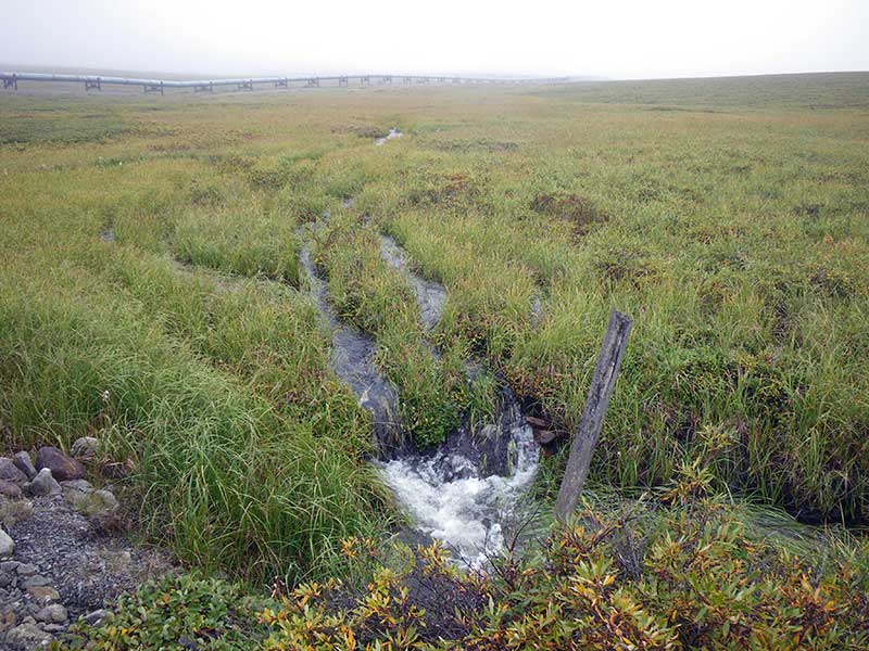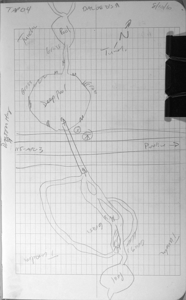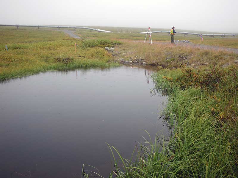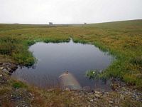 Comments: Outlet is completely submerged with deep outlet pool. Water too high to get accurate stream with and channel is braided. There were also minnow traps set out at this location probably by the UAF Toolik Lake. TAPS Access Rd 115-APL-3